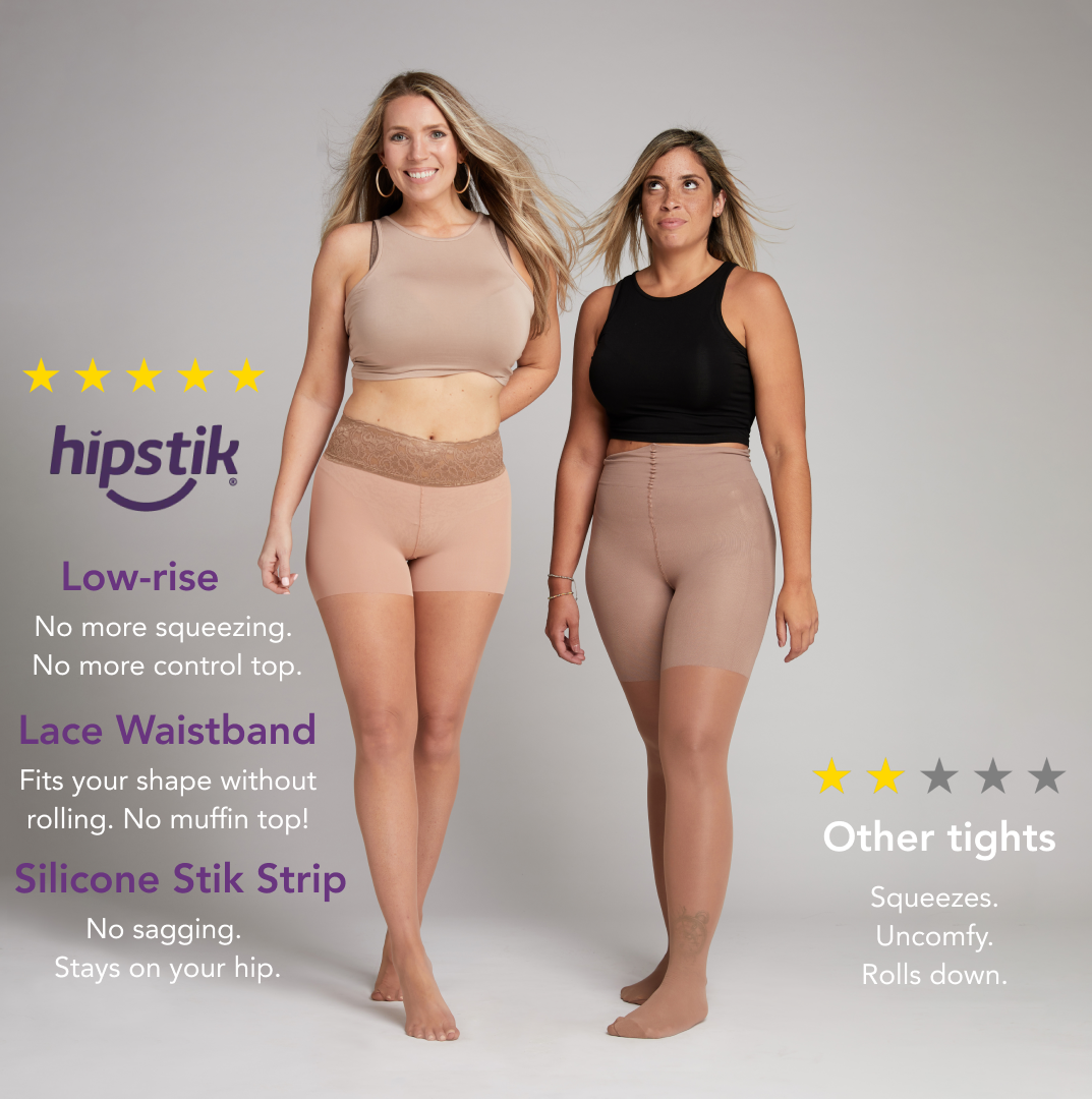 The signature low-rise comfort waistband is designed for your shape & fits naturally at your hips. Unlike control-top tights that squeeze and dig into you, making it uncomfortable to wear and sometimes hard to breathe, Hipstik Tights fit comfortably and naturally. They never squeeze, dig, roll, or itch.